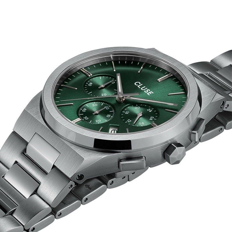 男らしく、多機能。最も洗練されたメンズウォッチ、それがCLUSE ヴィグルークロノグラフです。このメンズウォッチヴィグルークロノグラフは、一体型の24mmシルバーステンレスストラップ、サテン仕上げとポリッシュ仕上げのシルバー40mmケース、グリーンサンレイダイヤル、シルバーディテールの3つのサブダイヤルを備えています。卓越した品質と視覚的な魅力、そして会話のきっかけを与えてくれるスポーツウォッチです。