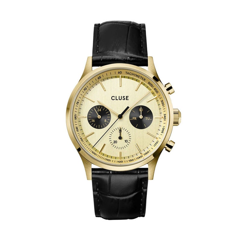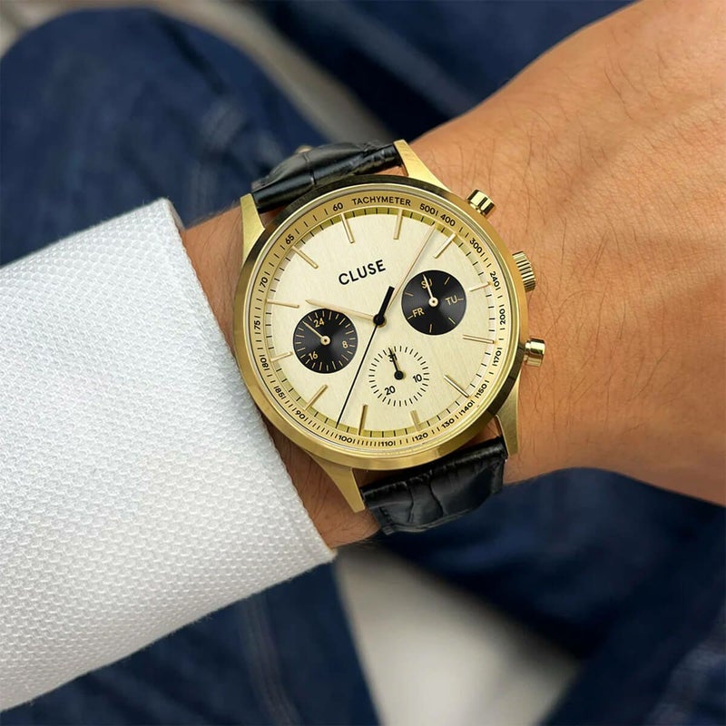 新しいスタイル、品質、価値の頂点を極めたこの時計は、洗練されたデザインと耐久性のある構造を兼ね備え、モダンな魅力を放ちます。42mmのブラッシュ仕上げとポリッシュ仕上げが施されたゴールドステンレススチールケースとブラックラウンドダイヤルを特徴とする穴瀬オールマルチファンクションは、手首に華やかさをもたらします。日付、曜日、時間を表示する3つのサブダイヤルがスポーティな印象を与えます。22mm幅のブラックレザーベルトはケースと完璧に調和し、どんな装いにも自然に溶け込むスタイリッシュで統一感のあるデザインを実現しています。