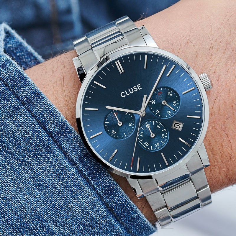 全ての世代で人気の高いクロノグラフに鮮やかなサンレイ仕様のブルーが珍しい、洗練されたミニマリズムと機能性が備わったアラヴィス。歴史ある伝統的なデザインを守りつつ、シルバー×ブルーはファッション性も高くしビジネスシーンもカジュアルも活躍できます。全体を高品質なステンレススチールで仕上げ、5ATM防水もありデイリー使いに十分過ぎる仕様。ブルーのさりげないアピールが目に留まるセンス高のアイテムです。