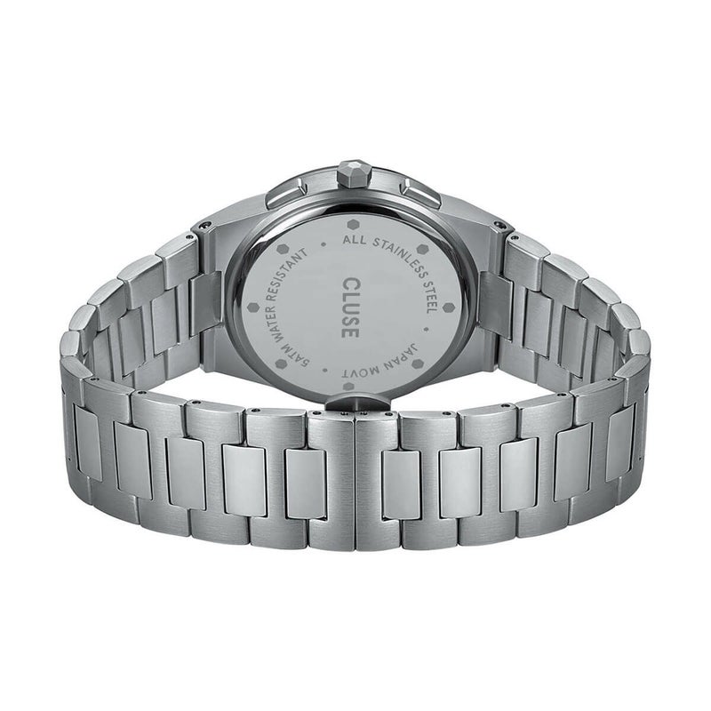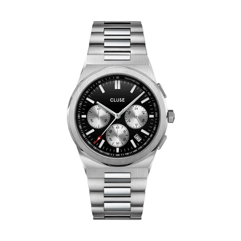 男性的で多機能。この洗練された男性用ヴィグルー・クロノウォッチは、一体型24mmシルバー・ステンレススチール製ストラップ、サテン仕上げとポリッシュ仕上げのシルバー40mmケース、ブラックの文字盤に3つのシルバーのサブダイヤルとシルバーのタキメーターを備えています。卓越した品質、視覚的な魅力、そして会話のきっかけとなるスポーツウォッチです。ストラップの調整と電池交換は、お近くの宝飾店で行うことをお勧めします。