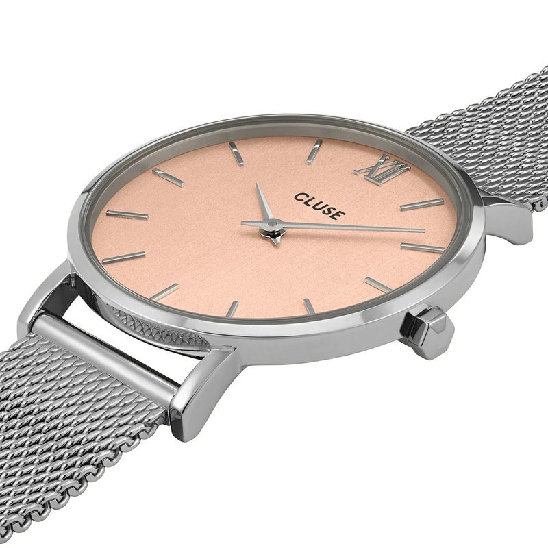 2020年2月発売の新作モデル 。CLUSEで最もクラシックなモデルのミニュイコレクション。シルバーにローズゴールドピンクのブラッシュドに仕上げた文字盤を合わせることでシルバーをよりカジュアルに楽しんでいただけるモデルになっています。