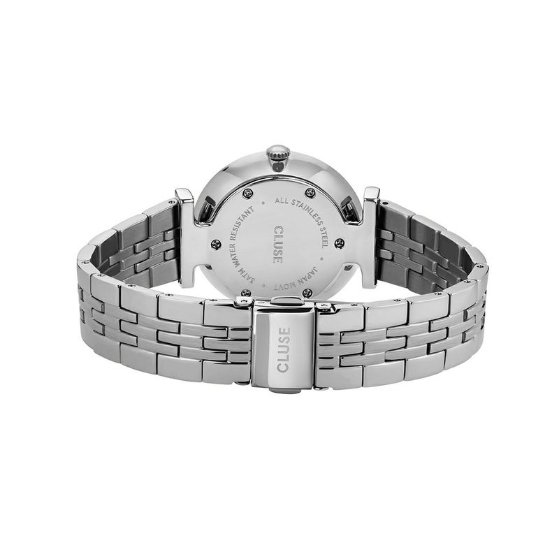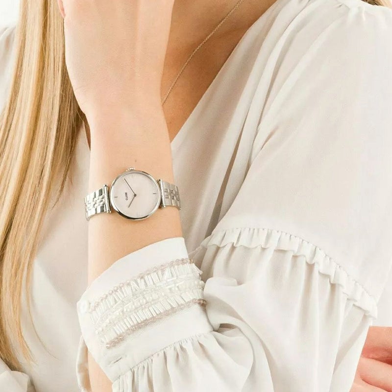 Tバーデザインのベゼルを採用したエレガントな印象のコレクション 。プッシュ式バックルで着け外しも簡単です。シャープなシルバーメタルバンドに光沢のある柔らかなピンクのマザーオブパール文字盤の組み合わせが印象的なモデル。天然のシェルなのでひとつひとつ色味や風合いが異なり、アクセサリー感覚で楽しめるアイテムです。この時計のベルトは16 mmの替えベルトと交換できます。
