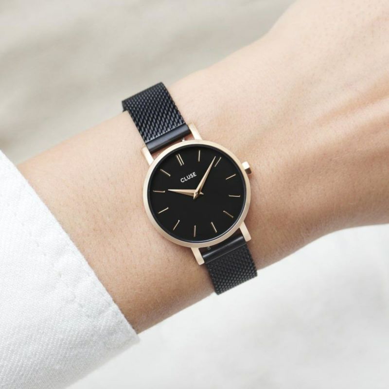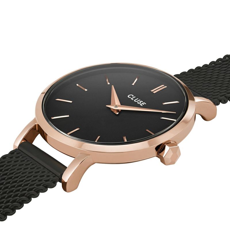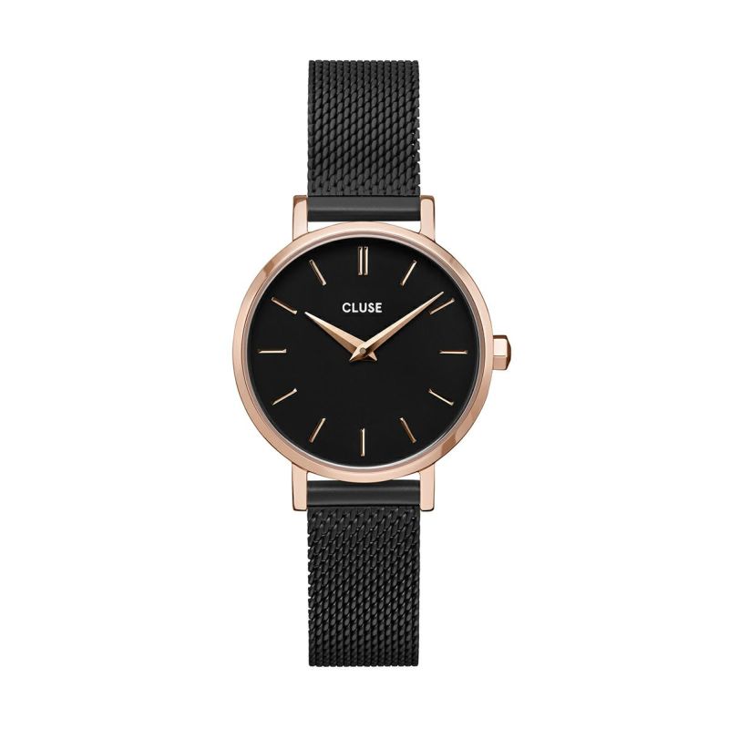 日本とフランスの限定展開コレクション。定番のミニュイよリも小ぶりな28mmのケースが程よい存在感と着けやすさを両立させています。マットなブラックメッシュベルトと光沢のあるローズゴールドケースのコントラストでより上品な印象をプラスしてくれます。
