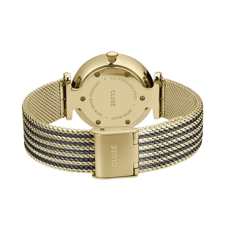 磨かれたゴールドの円形33 mmのケース、ブラックサンレイ文字盤、そしてゴールドとブラックのメッシュ16 mmストラップでデザインされています。友達とランチに行く、仕事に行く、夜遊びに行く、どんな場面でも、このTriomphe腕時計はあなたのルックに完璧な仕上げを提供します。この時計はステンレススチールのケースとストラップによって耐久性を備えており、長くご愛用いただけます。