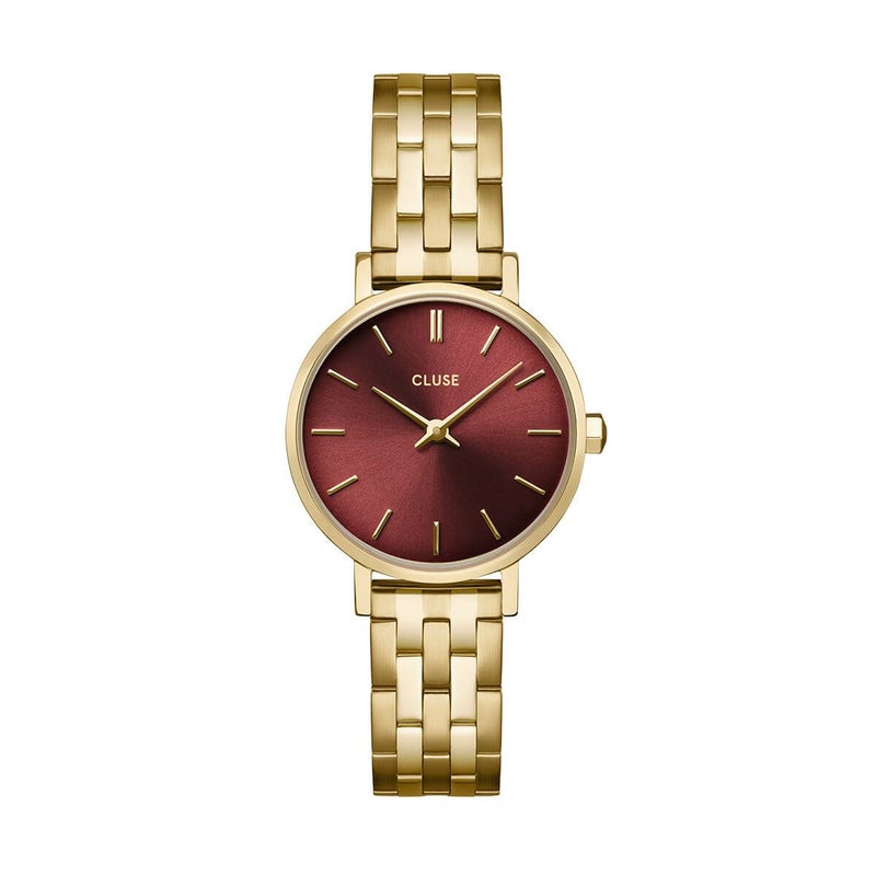 CLUSE新色ダークチェリーを採用。赤みブラウンが落ち着いていて大人可愛い印象。ベルトの長さはスライド式で自分で調整可能です。ベルトはスライド式のバックルで自分で調整可能です。この時計のベルトは12 mmの替えベルトと交換できます。