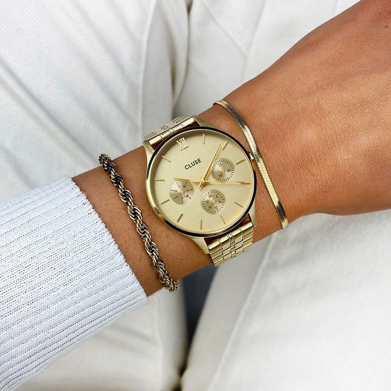 ミニュイ マルチファンクションウォッチを使って、普段の洋服にスタイルと洗練をプラスしましょう。34mmの丸いゴールドカラーケース、5リンクのストラップ、そして日付と時間を追跡するための3つのサブダイヤルを備えた、このフルゴールドウォッチは、究極の時計アクセサリーとなること間違いありません!クリーンなデザインを維持しながら、美しいミニュイ マルチファンクションはあなたのスタイルを高め、どんな服にも時を超えた魅力を与えます。16mmのストラップで時計を簡単に個性化できます。ストラップの調整も快適に素早く行えます。