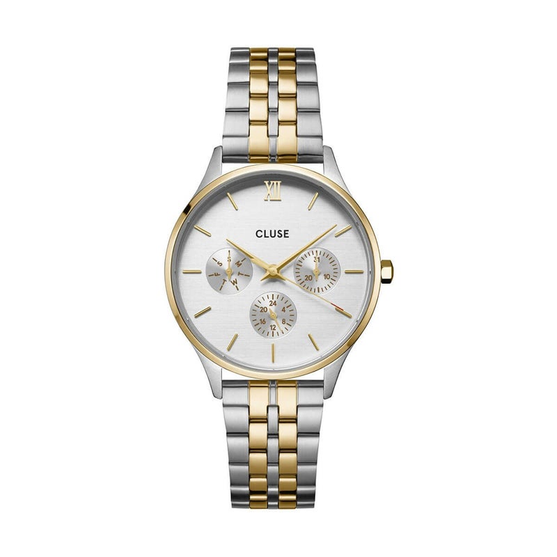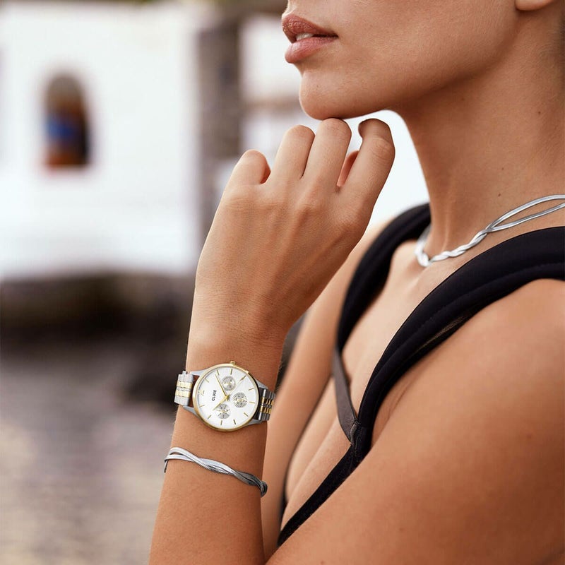 ミニュイ マルチファンクションウォッチで、毎日のワードローブにスタイルと洗練されたセンスを。ゴールドとシルバーの34mmラウンドケース、5リンクのストラップ、曜日と時刻を表示する3つのサブダイヤルを備えたバイカラーウォッチは、究極の計時アクセサリーになること間違いなし!16mmのストラップで、時計の外観を簡単にカスタマイズできます。ストラップのサイズはご自身で調整できます。