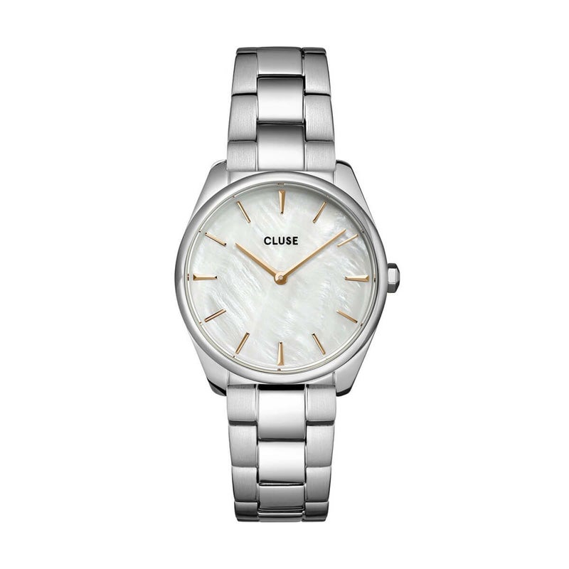 この現代的な魅力は、日常生活でも特別な日でも、エレガントなスタイルのお供となります。フェローチェペティットは、サイズこそ縮小されていますが、ディテールは変わっていません。31.5mmのシルバーラウンドケース、3リンクのシルバーステンレスストラップ、ホワイトパールダイヤルとローズゴールドの針が特徴です。この時計は、あなたのすべてのルックスの完璧な仕上げのタッチです。このフェローチェペティットのストラップは、16mmのCLUSEウォッチストラップと簡単に交換することができます。