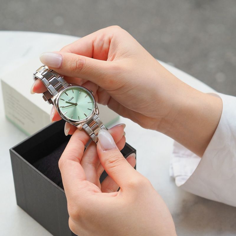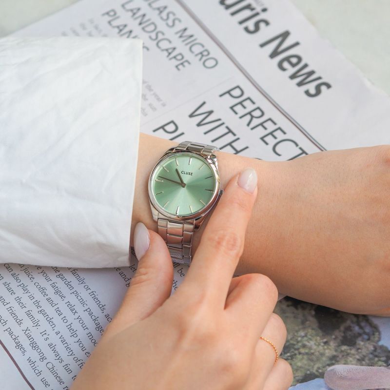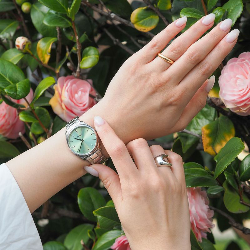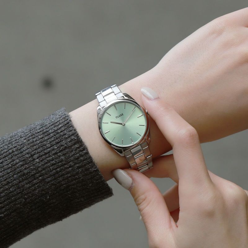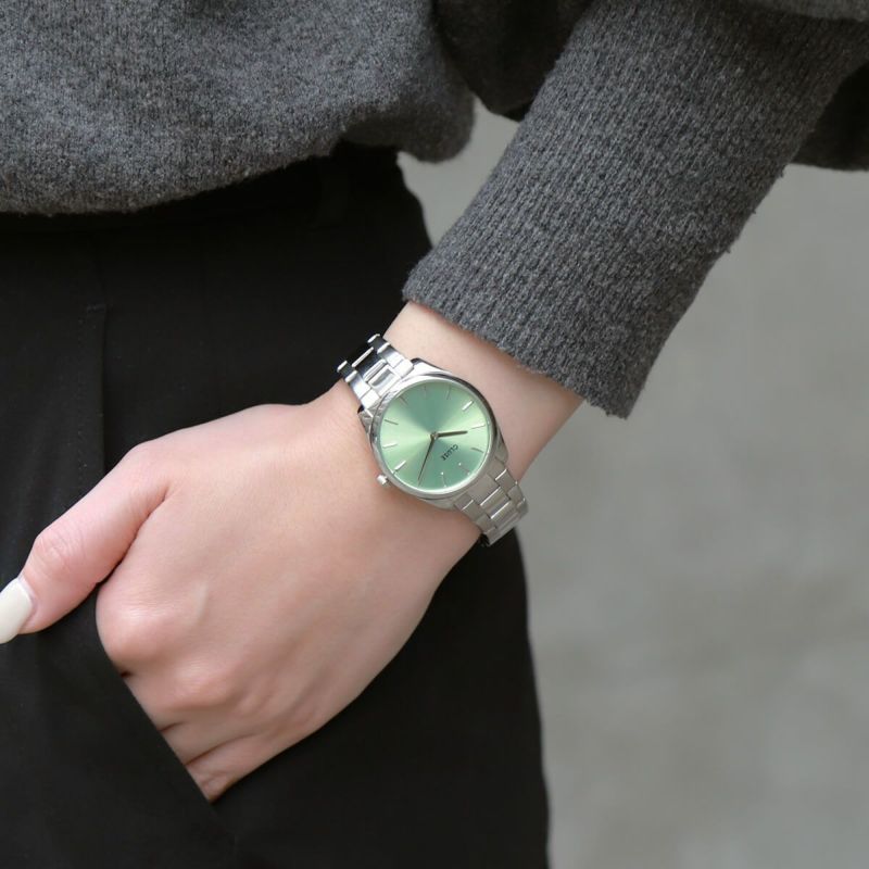 ライトグリーンとシルバーカラーのF?roce Petiteウォッチは、あなたのルックにスパイスを加えます。31.5mmのシルバーカラーのラウンドケース、ライトグリーンのダイアル、16mmのシルバーカラーのステンレススチールストラップが特徴的です。ミニマルでありながらユニークな魅力を放つこの時計は、どんなスタイルにもマッチします。