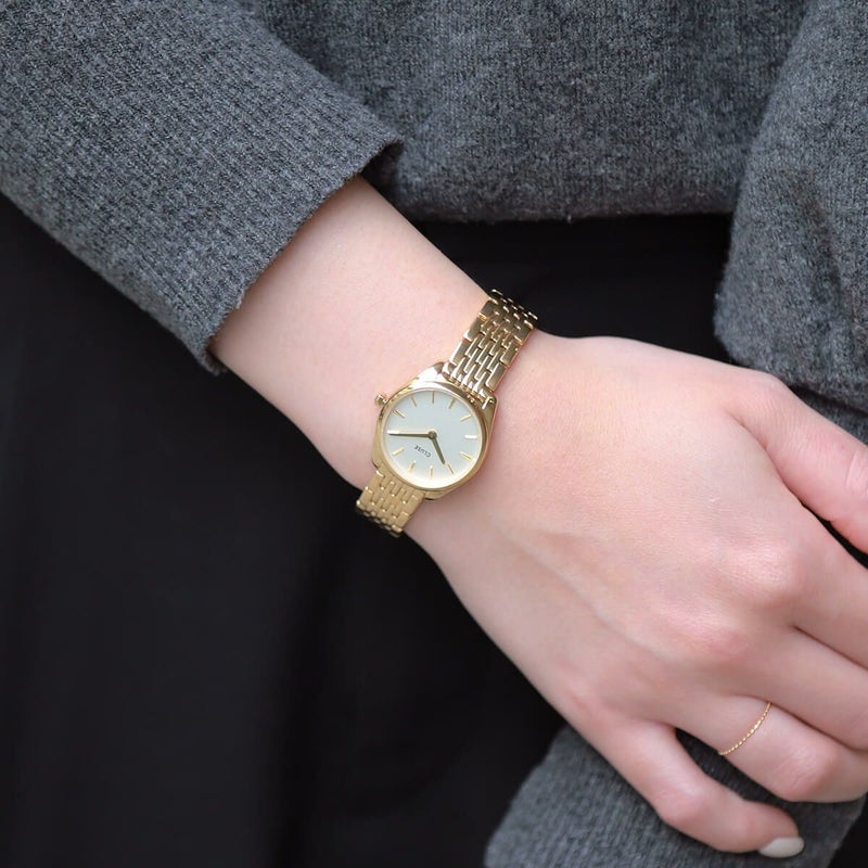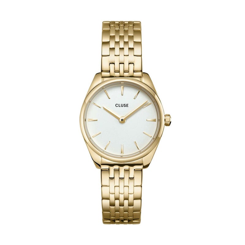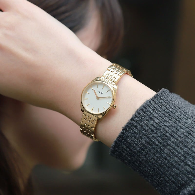 ベストセラーのF?roceコレクションに追加された最小のモデルでありながら、独自の存在感を放っています。CLUSE F?roce Miniは、ミニマリズムと洗練されたディテールを見事に融合させたウォッチです。ゴールドカラーの25mmラウンドケース、ホワイトダイアル、ゴールドカラーの7リンク12mmストラップで、この女性用フェローチェウォッチは確実に存在感を示すことでしょう。