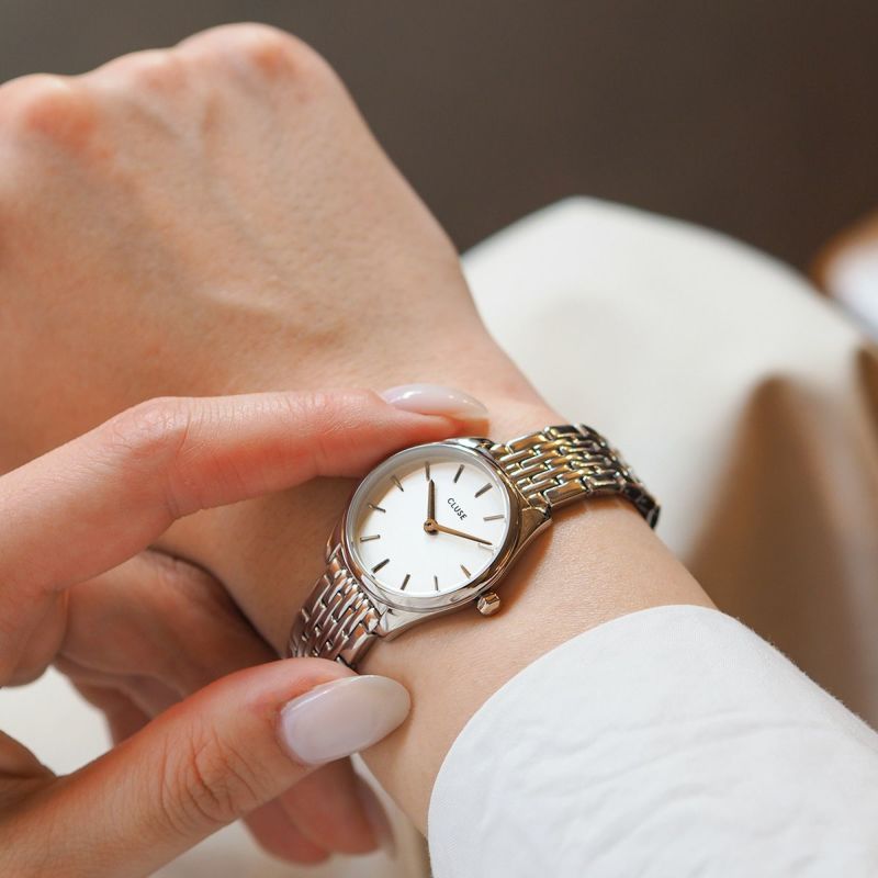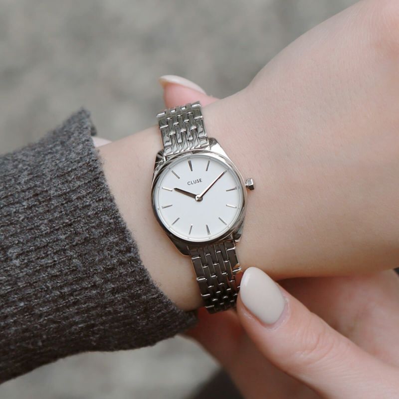 ベストセラーのF?roceコレクションに追加された最小のモデルでありながら、独自の存在感を放っています。CLUSE F?roce Miniは、ミニマリズムと洗練されたディテールを見事に融合させたウォッチです。ゴールドカラーの25mmラウンドケース、ホワイトダイアル、シルバーカラーの7リンク12mmストラップで、この女性用フェローチェウォッチは確実に存在感を示すことでしょう。
