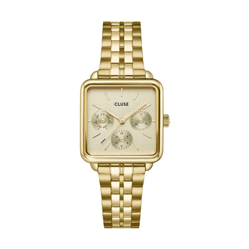 ラ・テトラゴン マルチファンクションウォッチで、毎日のワードローブをラグジュアリーで洗練された雰囲気に。30mmスクエアゴールドカラーケース、5リンクストラップ、曜日と時刻を表示する3つのサブダイヤルを備えたこのフルゴールドカラーの時計は、流行に左右されることなくお使いいただけます。16mmのストラップで時計の外観を簡単にカスタマイズできます。ストラップのサイズは自分で調整できます。