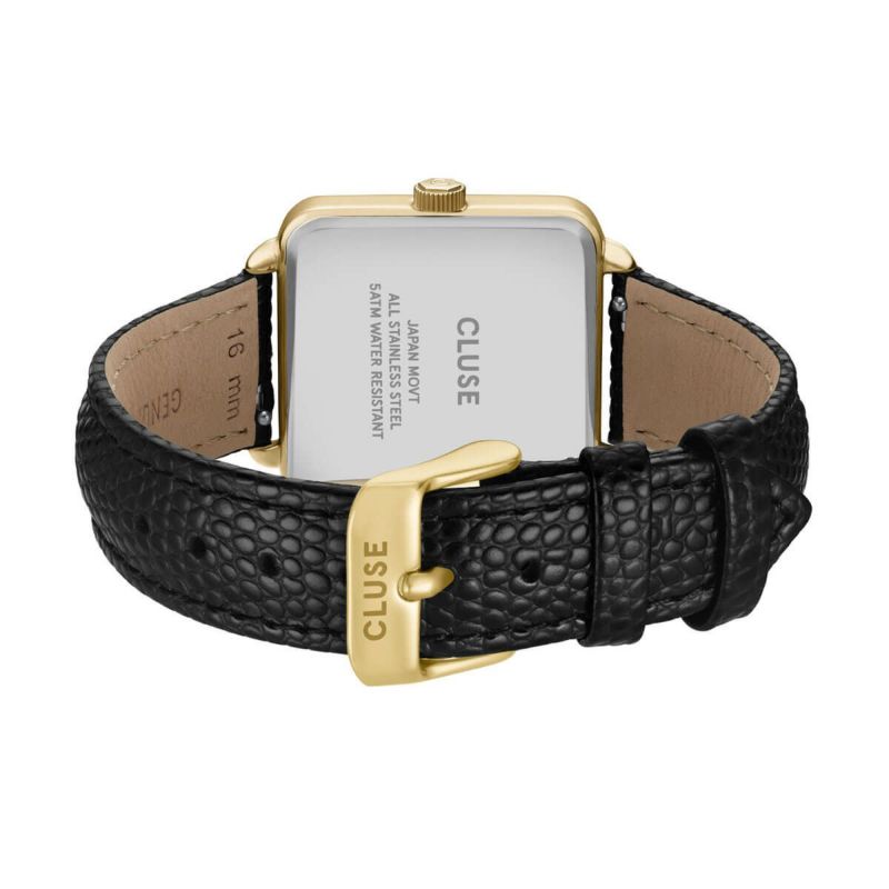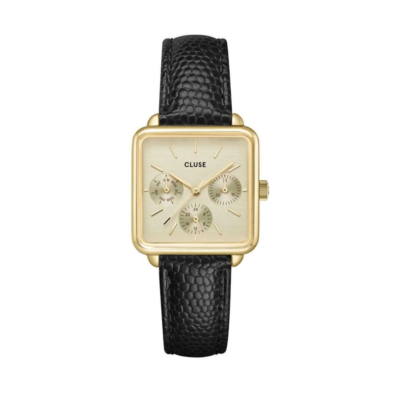 ラ・テトラゴン マルチファンクションウィメンズウォッチは、日常のワードローブに贅沢さと洗練を加えるアイテムです。30mmのスクエアゴールドカラーケースとダイヤル、16mmのブラックレザーリザードプリントストラップ、そして3つのサブダイヤルが特徴で、日付と時間を簡単に追跡できます。