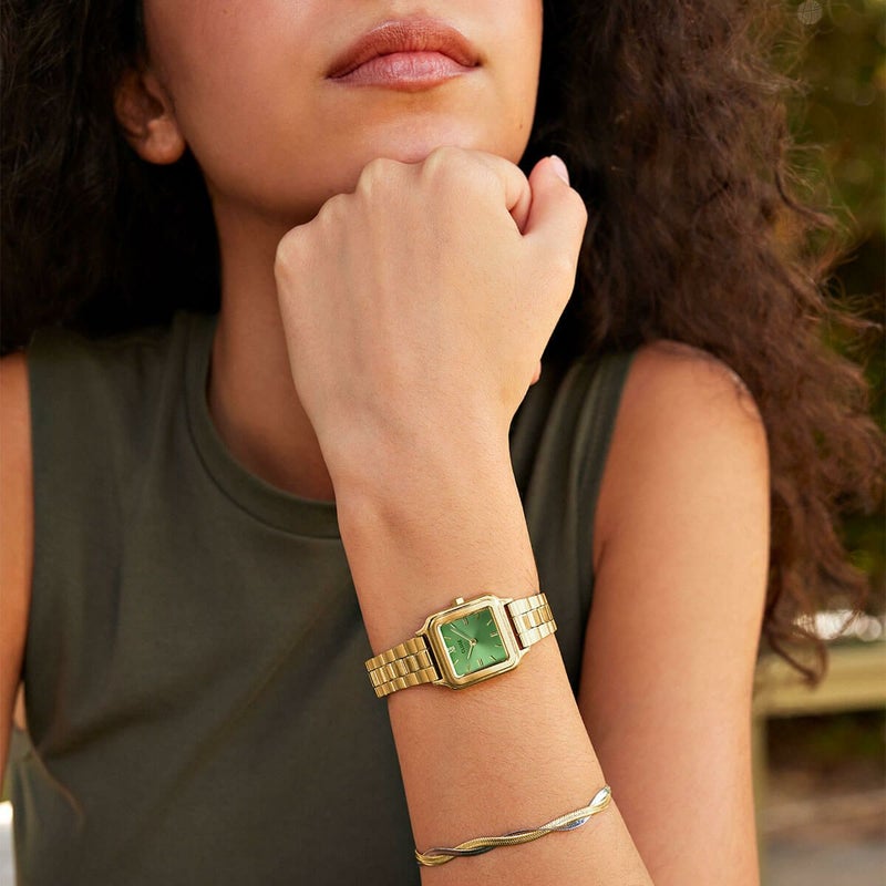 グラシューズ・ペティットレディースウォッチで、あなたのスタイルにラグジュアリー感と洗練さをプラスしましょう。24mmのスクエアゴールドケース、鮮やかなライトグリーンの文字盤、14mmのステンレスストラップ。14mmのストラップで、時計のルックを簡単にカスタマイズできます。自分で簡単にストラップのサイズを調整できます。