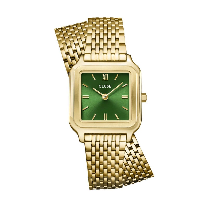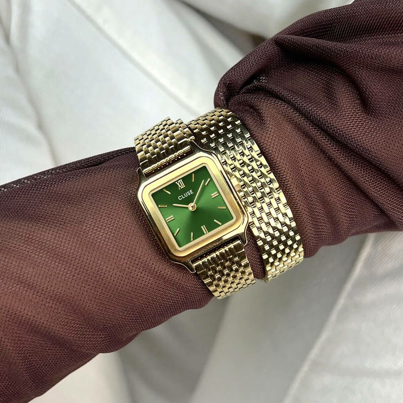 グラシューズ・ペティットレディースウォッチ。控えめな24mmケースに珍しい2重巻のメタルベルトは手元を華麗なエレガントを演出。ベルト自体が軽量で見た目のもたつきがなく計算されている。ゴールドとグリーンの腕時計の王道のカラーコンビに2重巻ベルト。ファッションの遊び心が利いた一目置かれるコーデを作ります。ベルトはスライド式のバックルで自分で調整可能です。この時計のベルトは14 mmの替えベルトと交換できます。