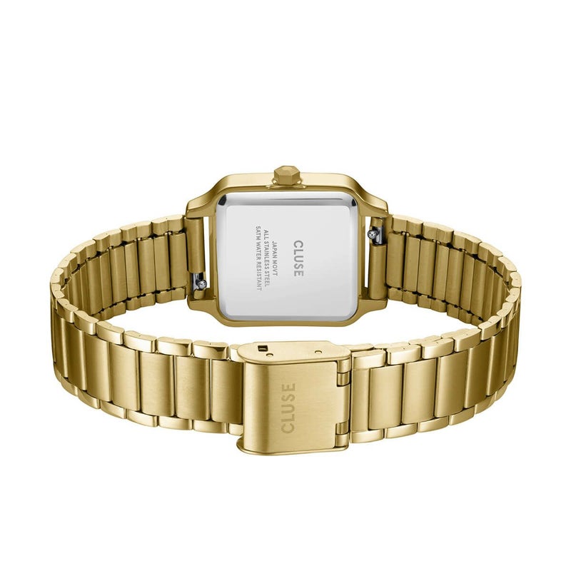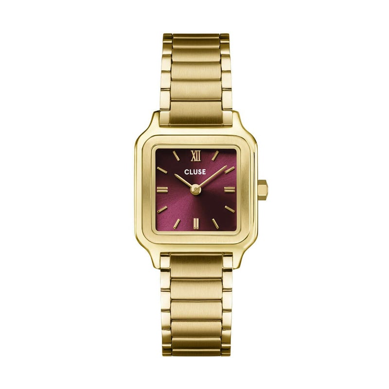 グラシューズ・ペティットレディースウォッチ。コーデにポイントを作る落ち着きのあるダークチェリーカラーを採用し、ゴールドケース全体のトーンを落とした絶妙の調和が美しい腕時計。ベルトと文字盤をスッキリとしたデザインにさせシックな雰囲気を作ります。ベルトはスライド式のバックルで自分で調整可能です。この時計のベルトは14 mmの替えベルトと交換できます。