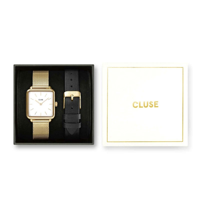 CLUSEのギフトボックスには、シックなゴールドカラーのラ・テトラゴンウォッチと、ブラックのレザーストラップが同梱されています。スクエアケースと丸みを帯びたエッジに映し出されるエレガンス。ラ・テトラゴーヌ」コレクションは、ライン、シェイプ、フォルムのモダンな遊びを表現しています。このギフトボックスには、ゴールドカラーのステンレススティール製ケースと、一目でそれとわかるスクエアフォルムが特徴のラ・テトラゴーヌ・メッシュ・ホワイトが収められています。ホワイトカラーの文字盤とポリッシュ仕上げのケースはエレガントで、28.5mmのケースサイズは、本物の美しさは小さなシェイプの中にあることを証明しています。ゴールドカラーの16mmストラップとブラックレザーストラップが付属し、この洗練されたモデルは、時代を超えた現代的なデザインを完璧に融合しています。