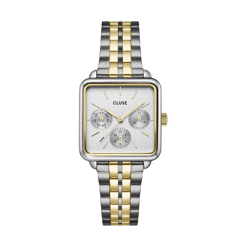 ラ・テトラゴン マルチファンクションウォッチで、毎日のワードローブをラグジュアリーで洗練された雰囲気に。ゴールドとシルバーの30mmスクエアケース、5リンクのストラップ、曜日と時刻を表示する3つのサブダイヤルを備えたバイカラーのタイムピースは、流行に左右されることなくお使いいただけます。16mmのストラップで時計の外観を簡単にカスタマイズできます。ストラップのサイズは自分で調整できます。