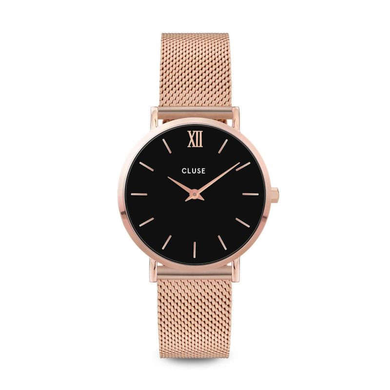 Minuit(ミニュイ)コレクション。12時部分にローマ数字があてられています。小ぶりなサイズながらも存在感があり、時計を見ている間、まるで時間が止まっているような感覚に陥ることでしょう。レザーベルトとメッシュベルトがあります。