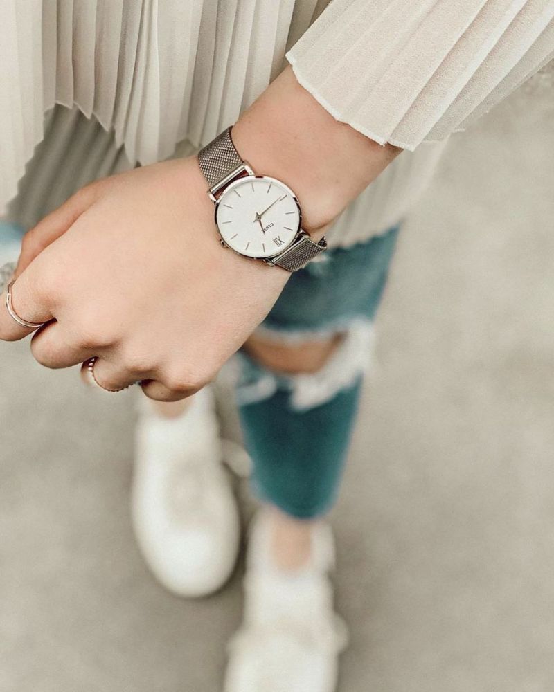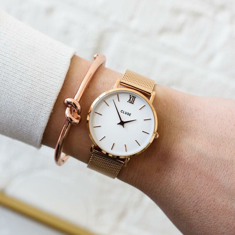 Minuit(ミニュイ)コレクション。12時部分にローマ数字があてられています。小ぶりなサイズながらも存在感があり、時計を見ている間、まるで時間が止まっているような感覚に陥ることでしょう。レザーベルトとメッシュベルトがあります。