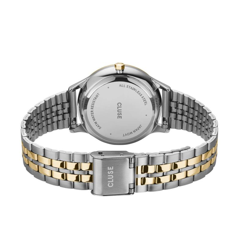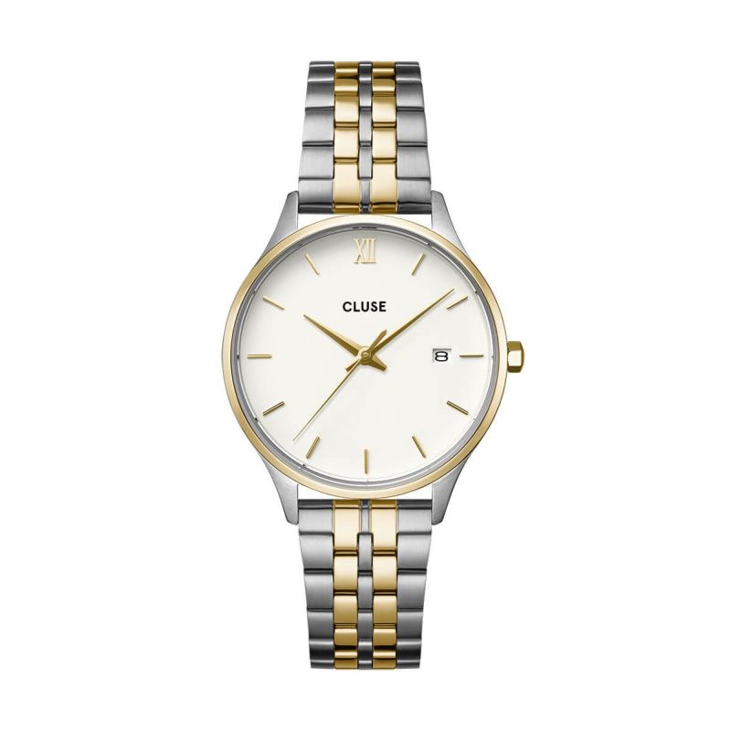 ゴールドとシルバーのバイカラーが手元をちょっとした高級感を演出。デイト機能が付いた視認性が高い人気のホワイトフェイスはシンプルなデザインに。ベルトはスライド式のバックルで自分で調整可能です。この時計のベルトは16 mmの替えベルトと交換できます。