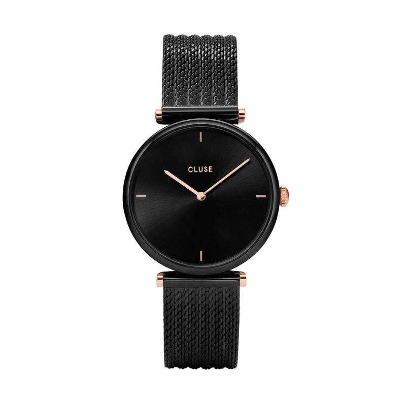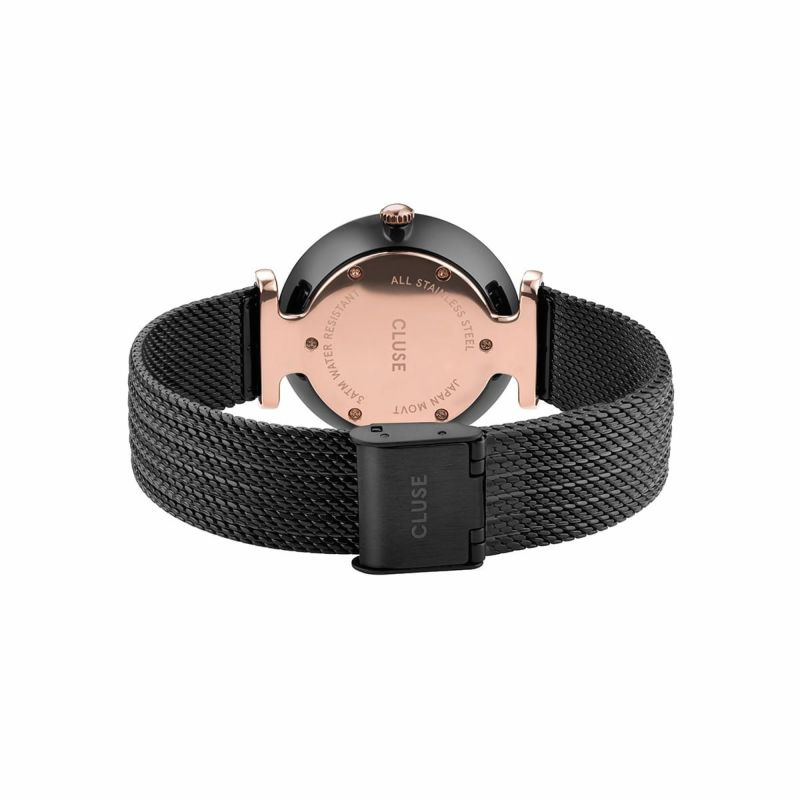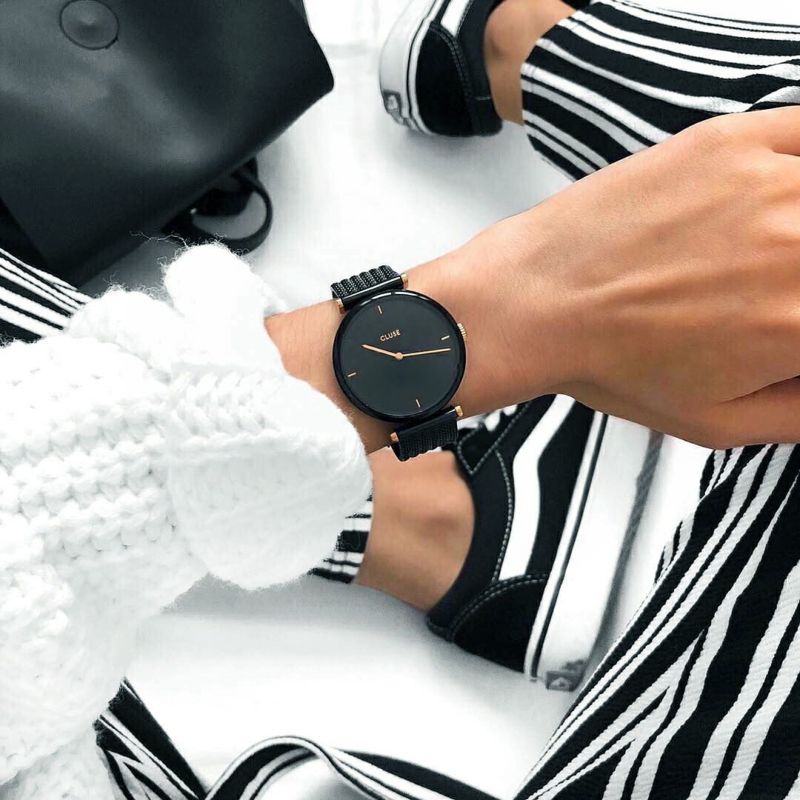 Tバーデザインのベゼルを採用したエレガントな印象のコレクション 。ブラックワントーンのストライプメッシュバンドが特徴。ケースもマットに仕上げることで全体的にモダンな印象になっています。この時計のベルトは16 mmの替えベルトと交換できます。