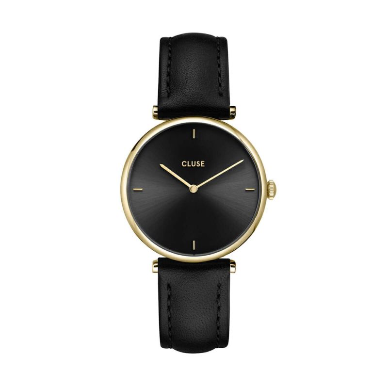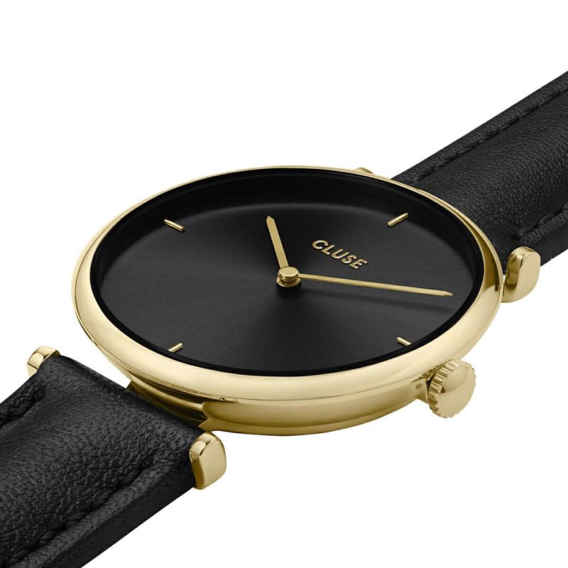 Triompheコレクションは、クラシックな魅力と興味深いアクセントを融合させています。エレガントなシルエットとTバーの接続は、顔の洗練されたシンプルさに注目を集めます。このTriompheモデルは、その黒い文字盤と合わせた黒いレザーストラップで深い闇に飛び込みます。金色のアクセントが施され、劇的なコントラストを創り出しています。