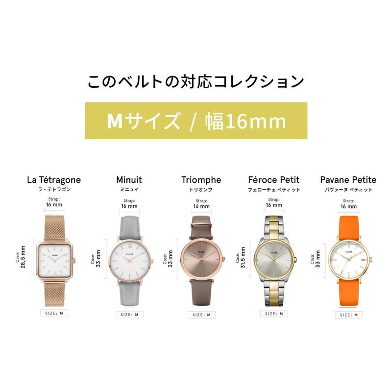 高品質のステンレススチールベルト(幅16 mm)。道具を使わず簡単に着脱できるクリックオン/オフシステムを搭載。 ※サイズ調整のコマ外しには専用の工具が必要なため、お近くの時計修理店で最適な装着感に調節することをお勧めします。