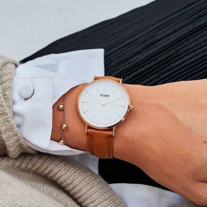 高品質のレザーベルト(幅18 mm)。道具を使わず簡単に着脱できるクリックオン/オフシステムを搭載。